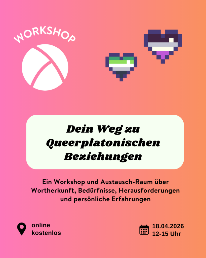 Für wen: Alle Personen von 16 – 27 Jahren, die sich auf dem aromantischen und/oder asexuellen Spektrum verorten und/oder die sich dabei noch nicht ganz sicher sind oder die sich einfach für Queerplatonische Beziehungen interessieren